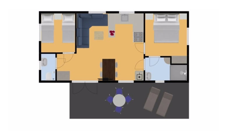 The trailer-chalet also has a modern bathroom with a shower cubicle and large washbasin and there is a separate toilet. The 4LCXL trailer-chalet has two separate bedrooms. One bedroom with a double bed and one bedroom with two single beds. There is electric heating in the trailer-chalet for extra warmth on cooler days.