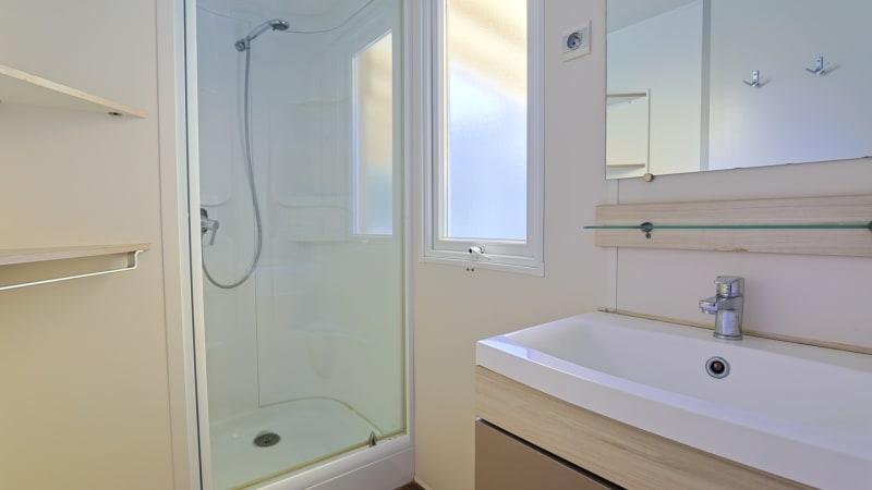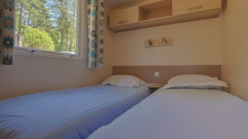 The trailer-chalet also has a modern bathroom with a shower cubicle and large washbasin and there is a separate toilet. The 4LCXL trailer-chalet has two separate bedrooms. One bedroom with a double bed and one bedroom with two single beds. There is electric heating in the trailer-chalet for extra warmth on cooler days.