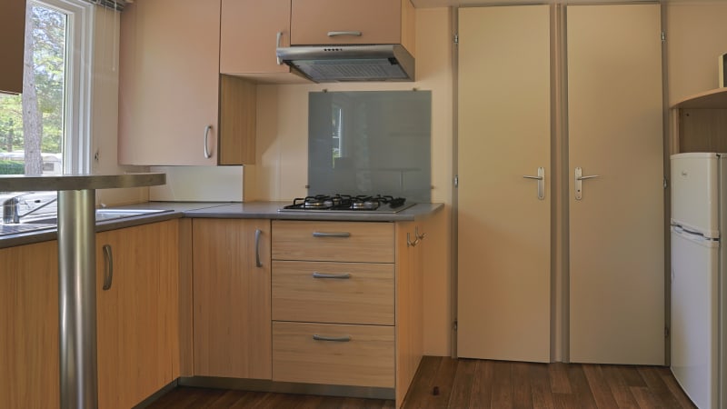 The living room is laid out in an L-shape. The 4LCLXL has a beautiful half-covered wooden terrace with garden furniture. You can move the sun beds, of course, so that you can also enjoy the French sun on the grass. The modern open kitchen with four-burner cooker, cooker hood, microwave, fridge freezer and four-person dining area means that you can enjoy a meal made by yourself or a pizza from our cook together.