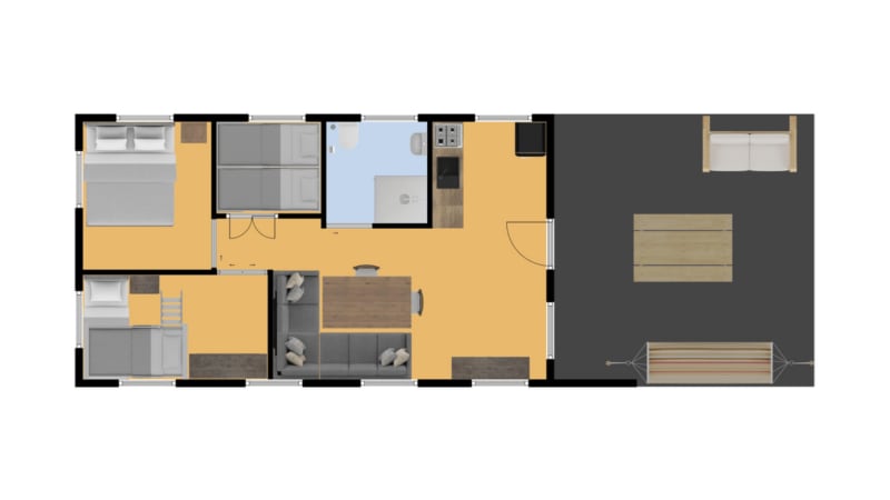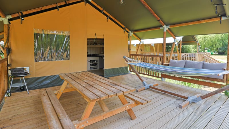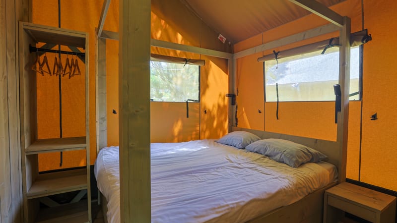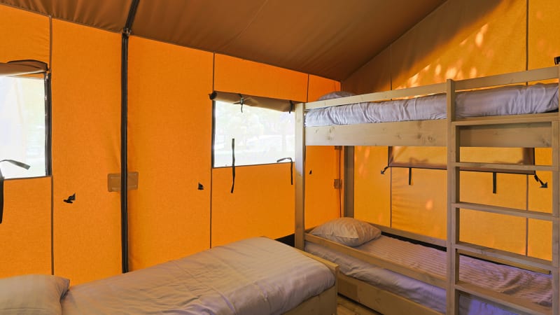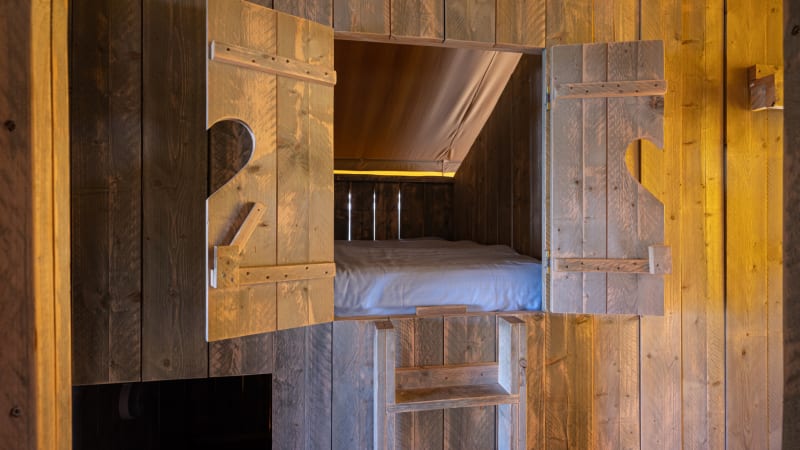The safari tent has three sleeping areas: one with a double bed, one with a triple bunk bed and a box bed for two (children). Each bed has a single duvet.