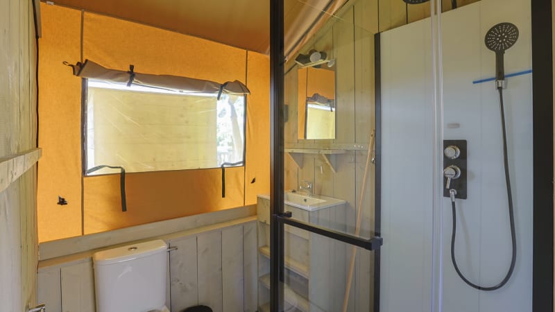 Bathroom The safari tent has a private bathroom with shower, sink and toilet.