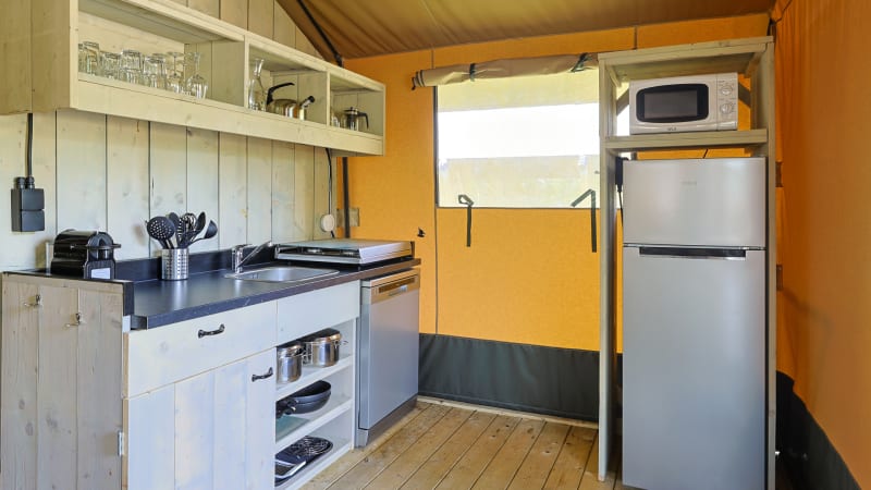The safari tent has a modern kitchen containing a fridge freezer, whistling kettle, a Nespresso coffee machine, a microwave, a 4-burner gas hob and a dishwasher.