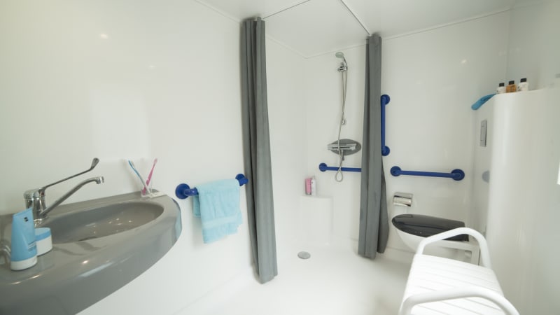 The bathroom has an open shower with supports and shower chair, a raised toilet with support and the washbasin is at adapted height.