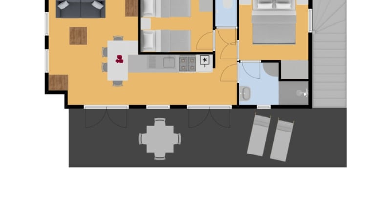 There is one bedroom with a double box spring (160 x 200 cm) and one bedroom with two single beds (80 x 190 cm). All beds are equipped with pillows and single duvets. The master bedroom has a direct connection to the bathroom.