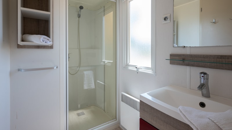 Bathroom The mobile home has a bathroom with washbasin, shower cubicle and plenty of storage space for towels and toiletries. There is a separate toilet.