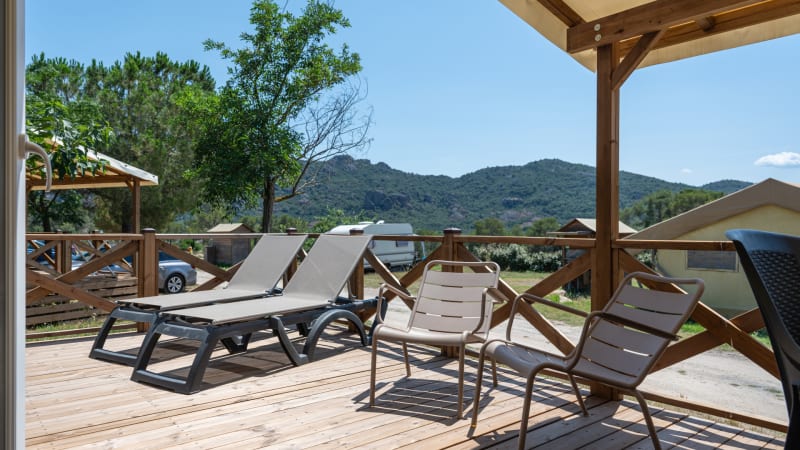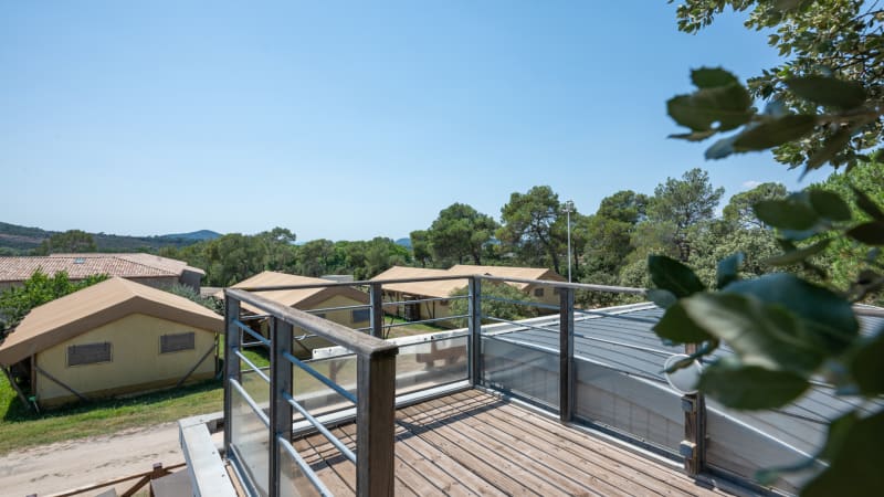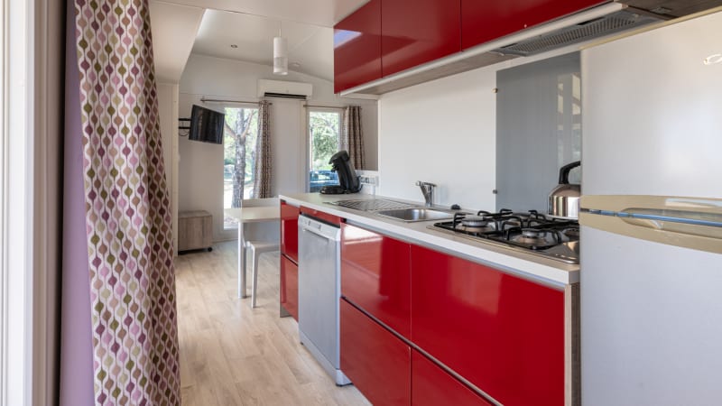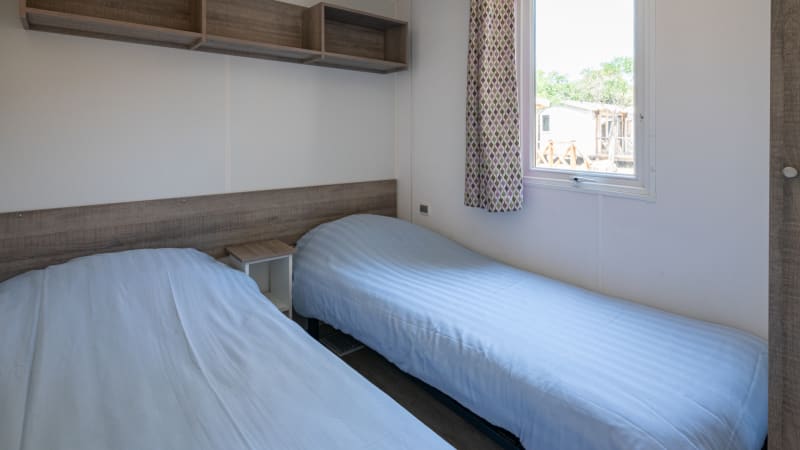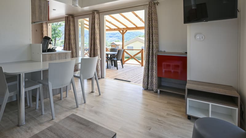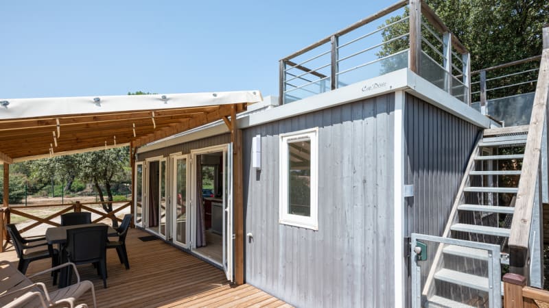 In the middle of beautiful French nature, this mobil home has several large windows for a fantastic view of the surroundings. On top of the mobil home's roof you will find a lovely sun terrace for private sunbathing, having breakfast in the sun or enjoying a night full of stars! The mobile homes are equipped with air conditioning.