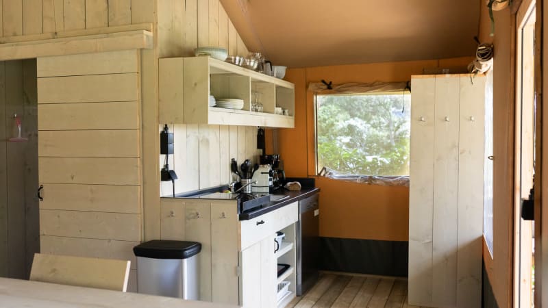 The safari tent has a spacious veranda with a comfortable lounge sofa, a picnic table and an electric barbecue. You can park your car next to the tent.