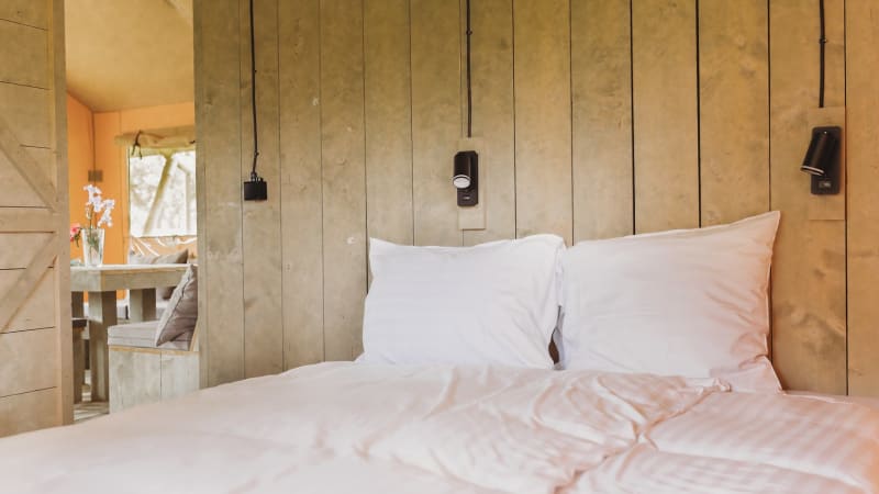 Bedrooms The safari tent includes two sleeping areas: one with a double box spring bed (160 x 200) and another with two single box spring beds (80 x 200). All beds come with pillows and single duvets.
