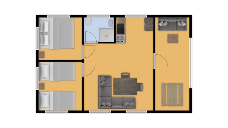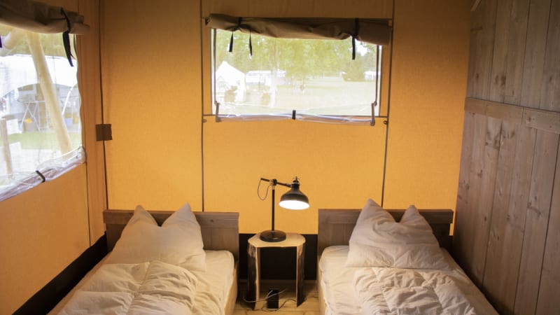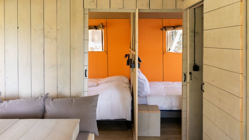 Bedrooms The safari tent includes two sleeping areas: one with a double box spring bed (160 x 200) and another with two single box spring beds (80 x 200). All beds come with pillows and single duvets.