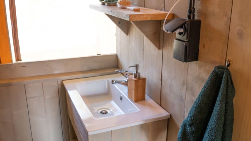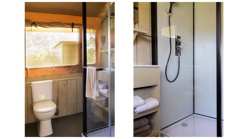 Bathroom You have a private bathroom in the tent with a shower, sink, and toilet.