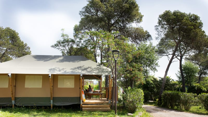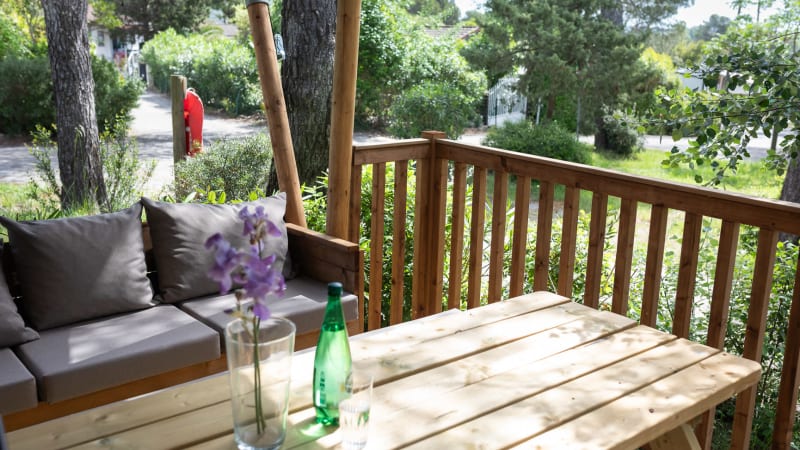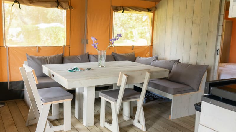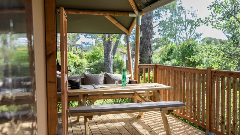 The safari tent has a spacious veranda with a comfortable lounge sofa, a picnic table and an electric barbecue. You can park your car next to the tent.