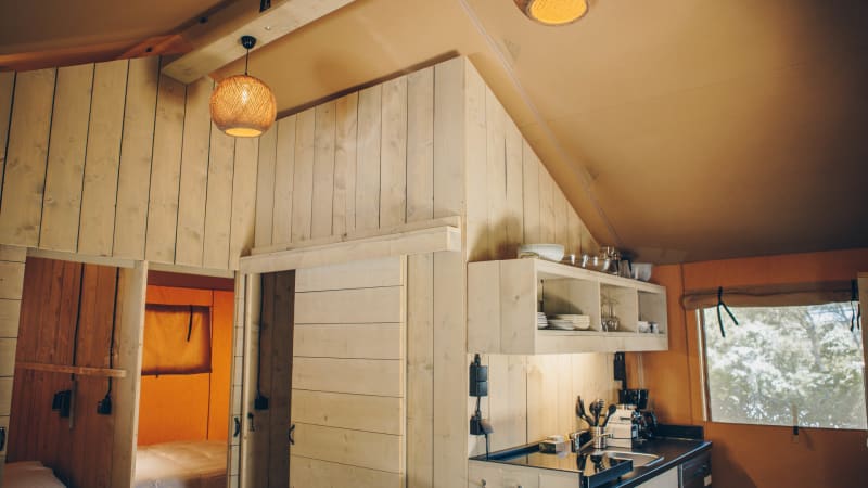 This detached, sturdy safari tent is suitable for up to 4 adults. The tent features a reclaimed wood interior.