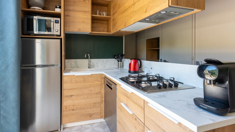 Kitchen The extensively equipped, luxury kitchen contains a refrigerator with freezer compartment, four-burner hob, dishwasher, Nespresso coffee maker, kettle and a microwave.