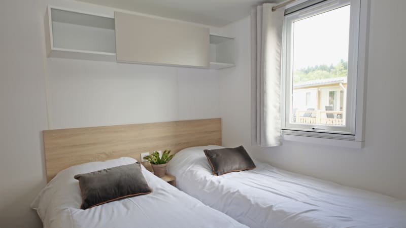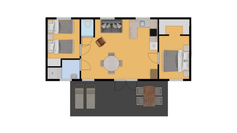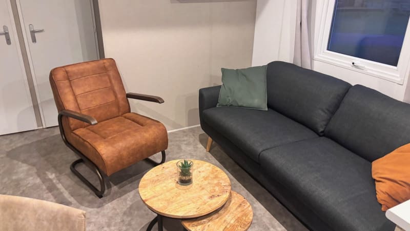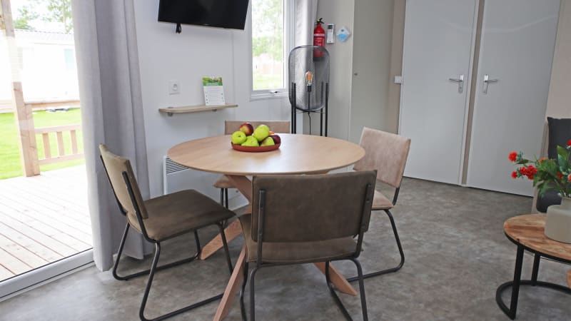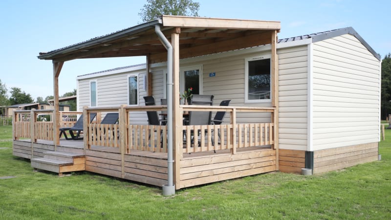 This luxury chalet has two bedrooms and a covered wooden terrace. The chalets are in a very central place in the park.
