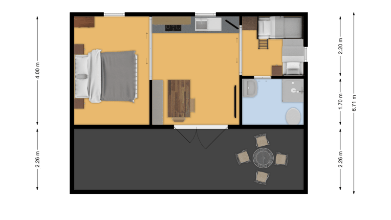 Outside A partially wooden terrace allows to always enjoy sitting outside. One car can be parked next to the mobile home.