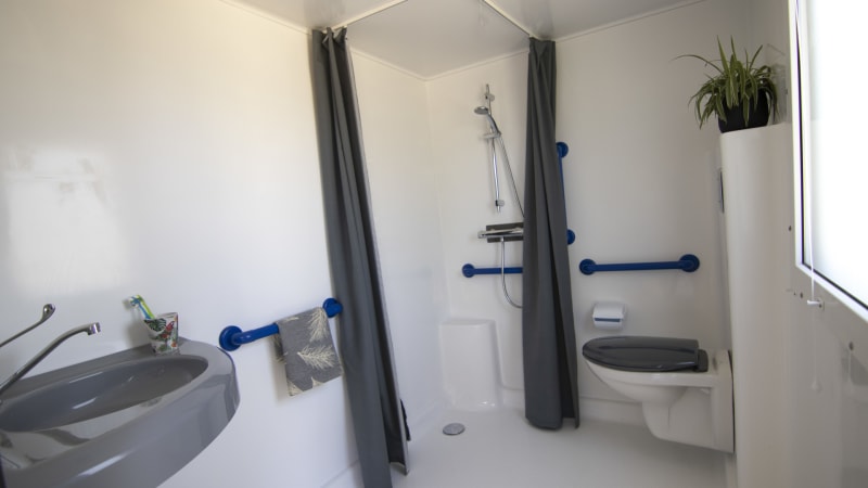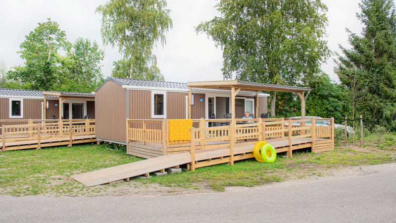 This adapted mobile home has two bedrooms and a partially wooden terrace. The mobile home is suitable for one wheelchair.