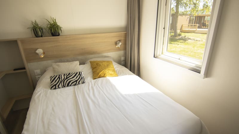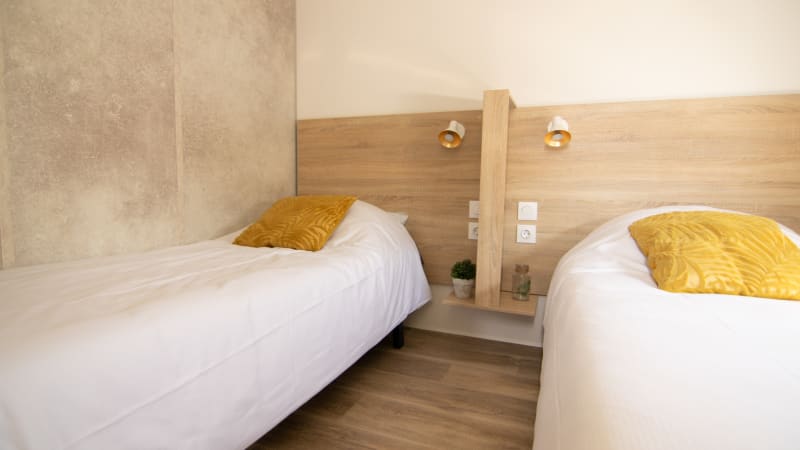 There is a 160x200 double bed and a bedroom with two single 80x190 beds in the four-person mobile home and a 160x200 double bed in the two-person chalet.