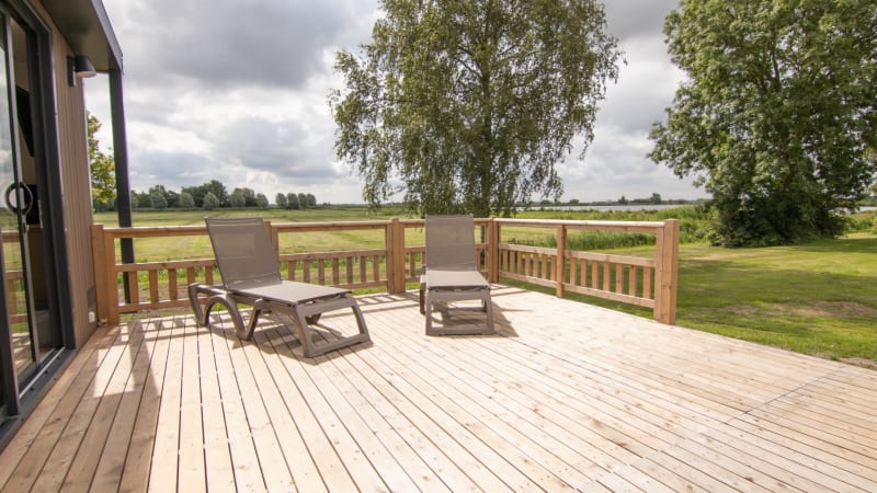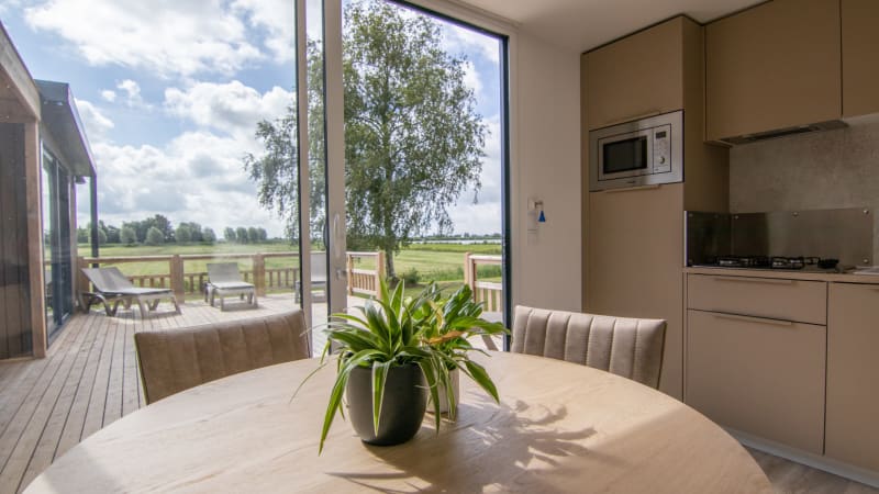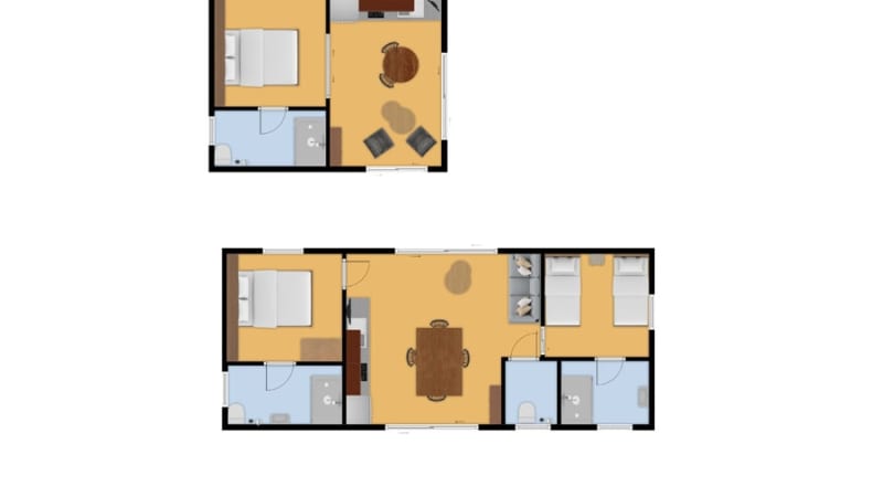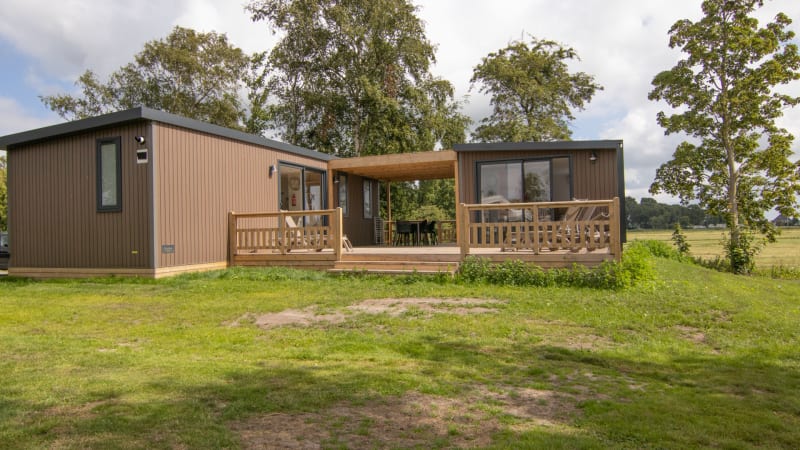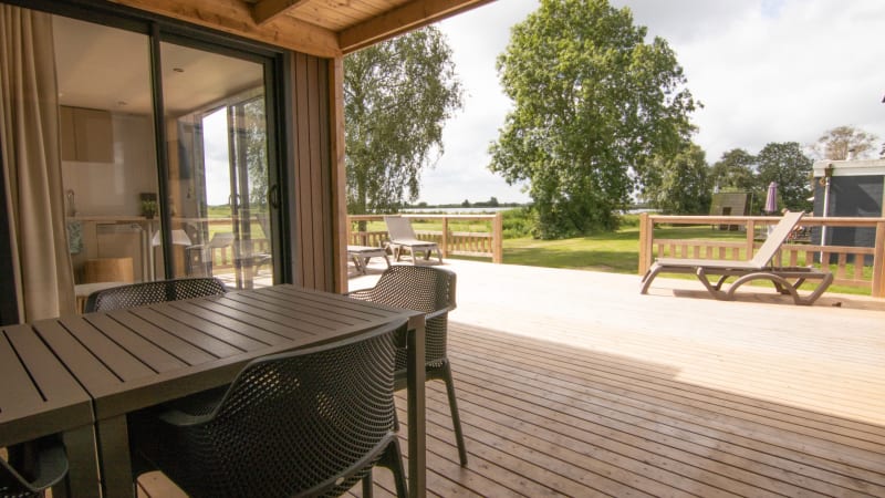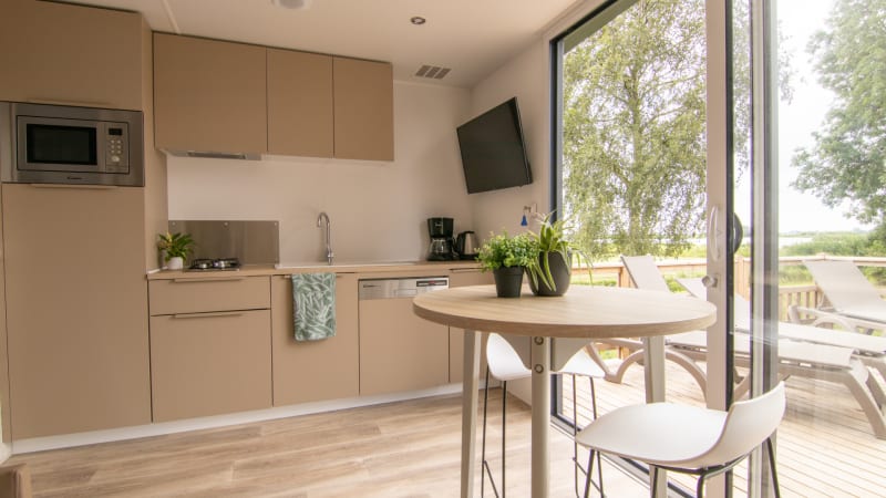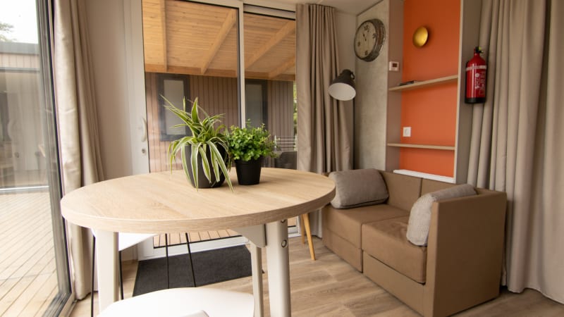 Both chalets have sliding doors to the terrace. There is a cosy sofa and a table and chairs in the four-person mobile home and a table and two chairs in the two-person chalet. There is air conditioning in both chalets.