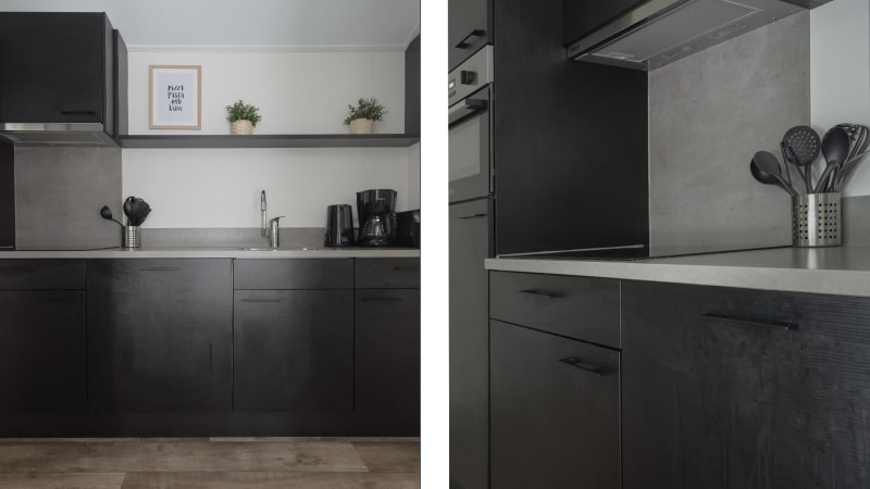 This modern new chalet (2023) is suitable for four people and has a partially covered terrace furnished with modern furniture. The spacious master bedroom has a large wardrobe and is furnished with two Swiss Sense box-spring beds.