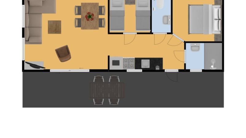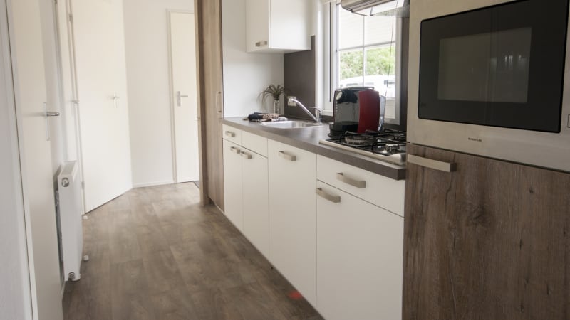 A chalet with a fully-furnished kitchen (including dishwasher, combination microwave and four-burner gas stove), LED television, two bedrooms, covered terrace incl. furniture, bathroom and separate toilet.