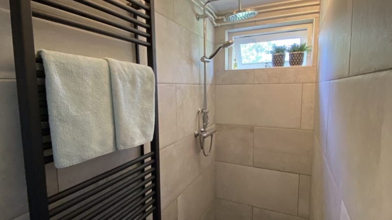Cosy three-room bungalow with open plan kitchen, central heating and wood burner, separate shower and toilet, and four single box spring beds.