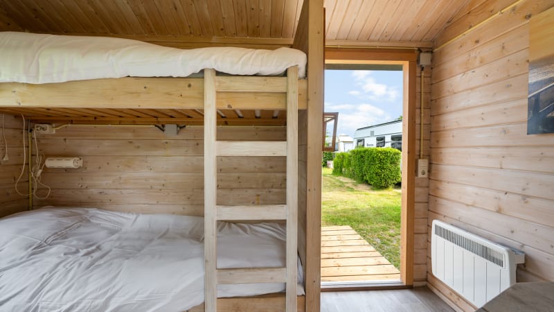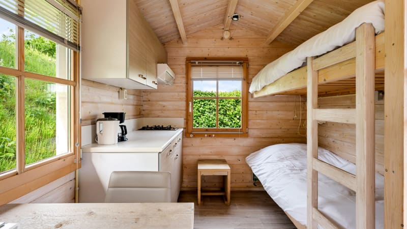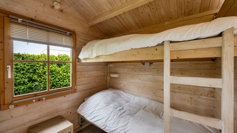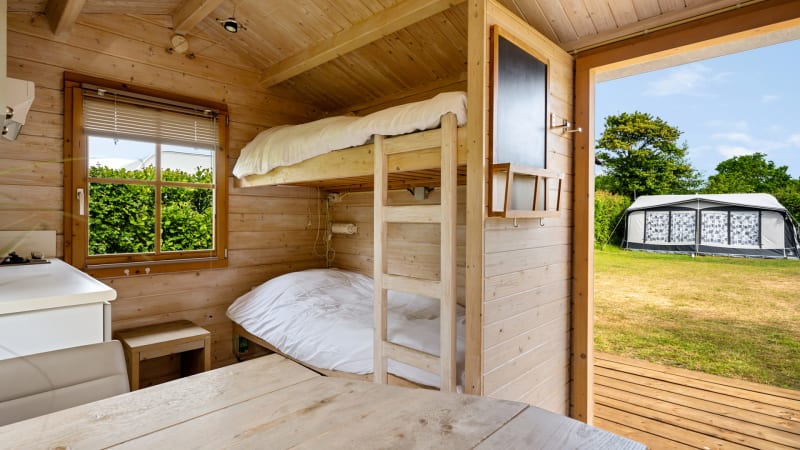 Bedroom There is sleeping space for a maximum of two people. The bunk bed is equipped with mattresses and two single duvets, as well as pillows. If you prefer not to have a bunk bed, you can book the Zeester camping chalet or the ‘t Gorsje camping hut.