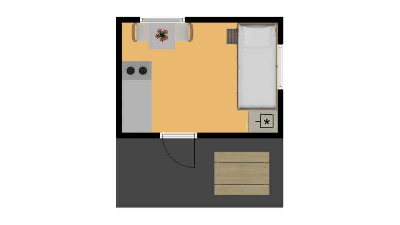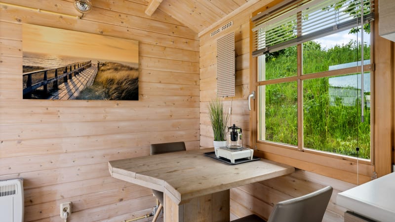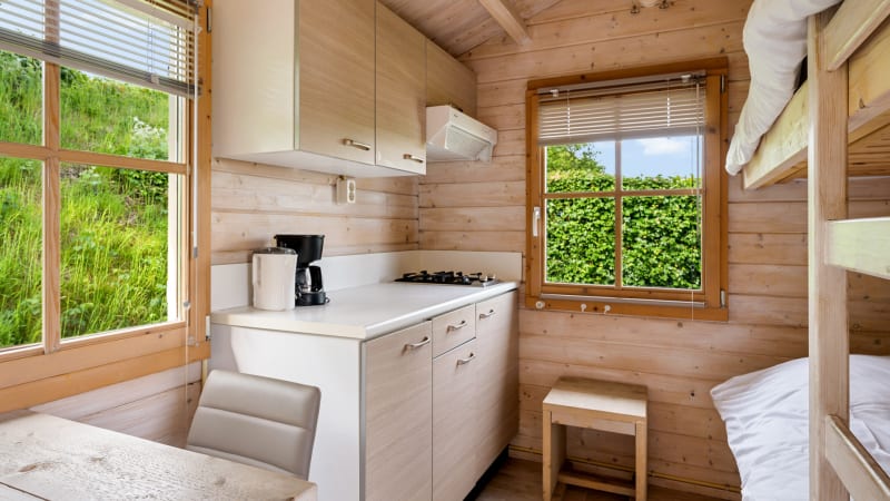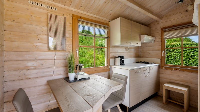 Kitchen The camping chalet has a small kitchenette with cooking plates (gas bottle) and an extractor hood. There is also a refrigerator, kitchen utensils, and a filter coffee maker in the kitchen. A cozy seating area is also provided. Good to know: there is no running water in the camping chalet. Please use the water points on the camping field or feel free to get water from our sanitary buildings.