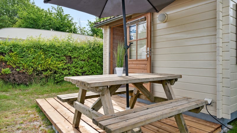 Outside In front of the camping chalet, you will find a small terrace with garden furniture. Parking is available at the beginning of the field, not near the accommodation.