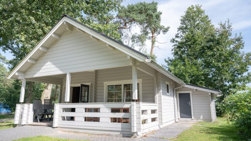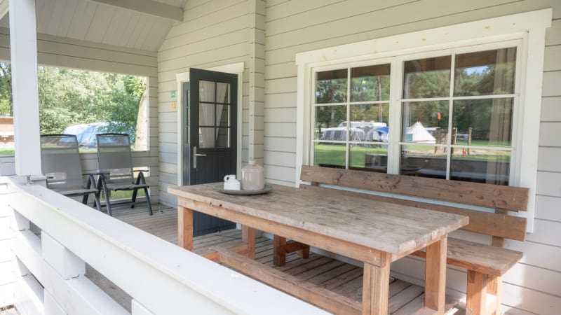 Outside On the cosy, spacious veranda – facing south and equipped with garden furniture for six people – you can relax until late in the evening. You can park your car close to the lodge.