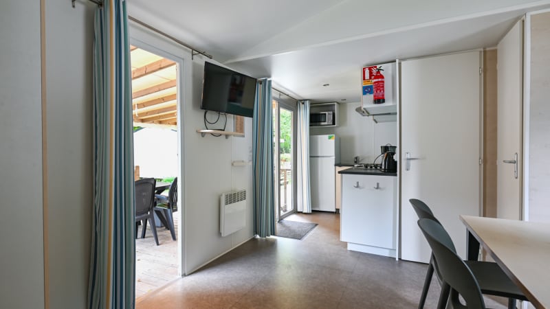 Les deux grandes portes-fenêtres donnent accès à la terrasse en bois.