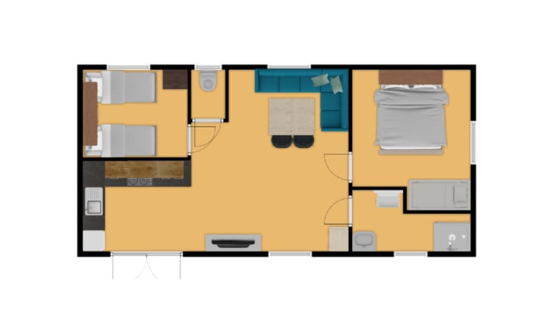 Ce chalet comprend une chambre avec un lit double (160x200) et une chambre avec deux lits simples (80x200).