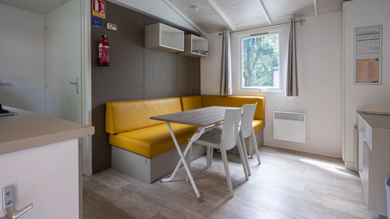 Ce mobil-home peut accueillir quatre personnes.Le mobil home dispose d'une salle de séjour confortable avec un coin salon et des espaces de rangement.Il est entièrement équipé :