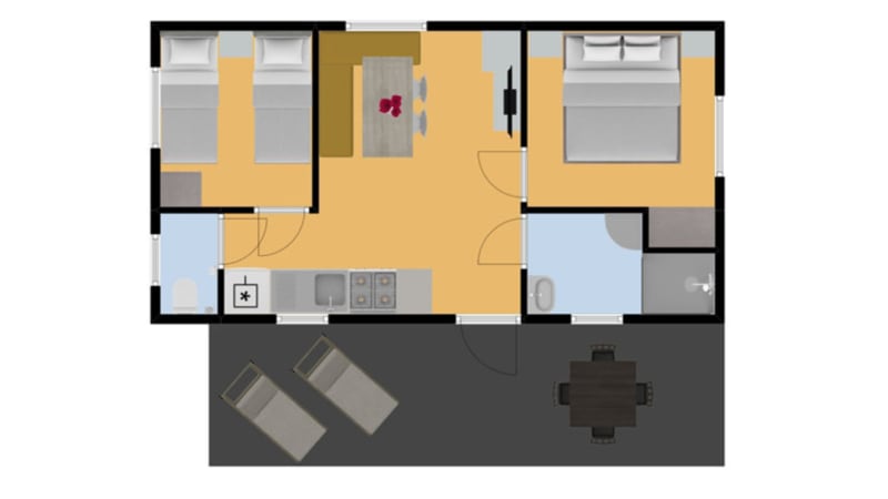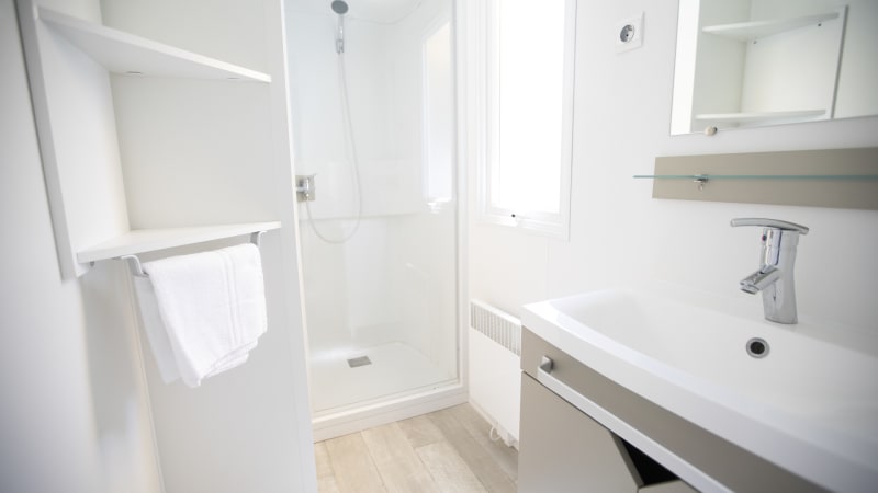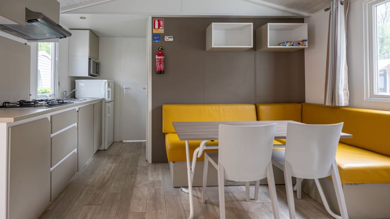 Ce type de mobil-home dispose d'une cuisine entièrement équipée comprenant une plaque de cuisson à gaz à 4 feux, une bouilloire, cafetière à filtre, un réfrigérateur-congélateur et un four à micro-ondes.