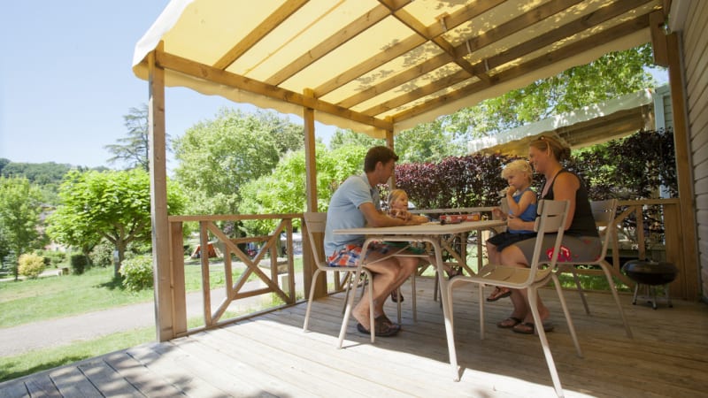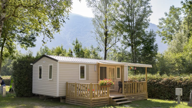 La terrasse semi-couverte est équipée de meubles de jardin, de deux chaises longues et d'un séchoir. Une place de parking est située à proximité du mobil-home.