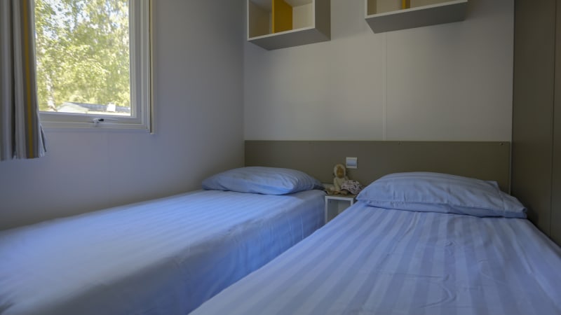 Il y a deux chambres à coucher. Une chambre avec un lit double (160x190) et une chambre avec deux lits simples (80x180). Tous les lits sont équipés d'oreillers et de couettes simples. L'ajout d'un lit bébé n'est possible qu'en enlevant un autre lit.