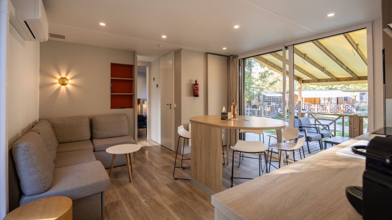Ce mobil-home pour six personnes, spacieux et luxueux, est situé en plein cœur de la nature, dans un endroit magnifique avec vue sur le camping.