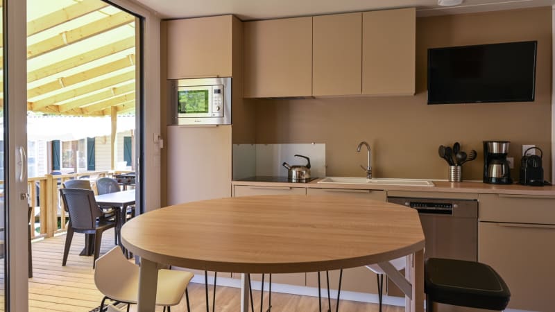 Le mobil-home comprend une cuisine spacieuse et luxueuse avec tous les ustensiles de cuisine indispensables, un grand réfrigérateur avec compartiment congélateur, une plaque de cuisson à 4 feux, une machine Nespresso, une cafetière à filtre, une bouilloire, un micro-ondes combiné et un lave-vaisselle.