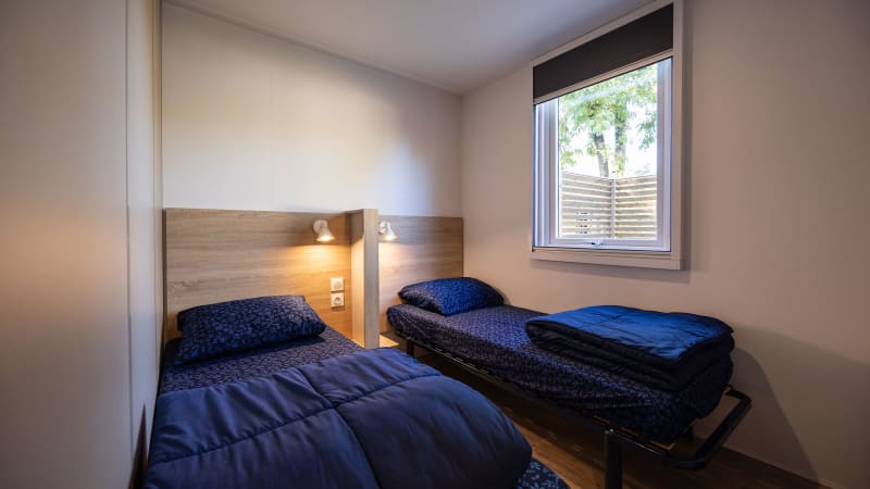 Le mobil-home comprend trois chambres : une avec un lit 2 personnes de 1,60 m x 2 m, une avec deux lits 1 personne de 0,80 m x 1,90 m et une avec deux lits superposés 1 personne de 0,80 m x 1,90 m. Chaque lit est pourvu d’une couette une personne. Il est possible de placer un lit de bébé, mais dans ce cas il faut enlever un autre lit.