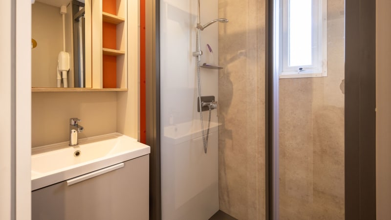 Ce mobil-home dispose de deux salles de bains spacieuses : une salle de bains attenante à la chambre principale, comporte une douche, un lavabo, des toilettes et un sèche-cheveux. L'autre salle de bains comprend une douche, un lavabo et un sèche-cheveux. Il y a aussi des toilettes séparées.