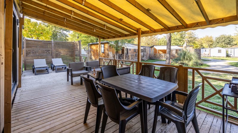 Le mobil-home est doté d'une très grande terrasse (30m²), surélevée et semi-couverte, qui offre une superbe vue sur le camping. Vous pouvez choisir de vous y installer à l'ombre ou au soleil. La terrasse comprend une table de jardin avec six chaises, deux jolis transats, un salon confortable et un barbecue à gaz. Vous pouvez garer la voiture à côté du mobil-home.