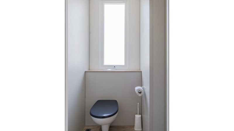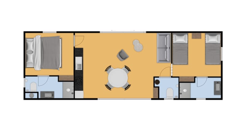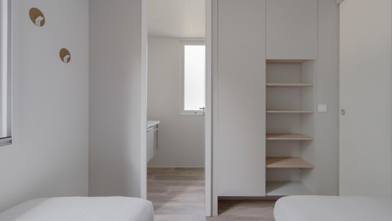 Ce mobil-home comprend deux chambres : une chambre avec un lit deux personnes de 1,60 m x 2 m et une chambre avec deux lits une personne de 0,80 m x 1,90 m. La suite parentale (première chambre) a sa propre douche spacieuse et luxueuse dans la chambre. Il y a aussi des toilettes et un meuble-vasque suspendu avec espace de rangement intégré. Chaque lit est pourvu d’une couette pour une personne et d’un oreiller.