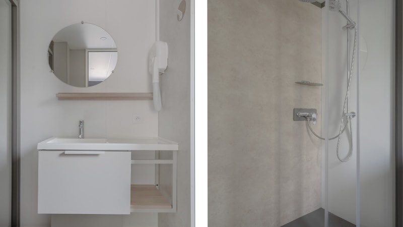 Le mobil-home dispose de 2 salles de bains, une dans la suite parentale et une 2ème séparée. Dans les deux salles de bains, il y a un lavabo, une cabine de douche et un grand espace de rangement pour les serviettes et articles de toilette.