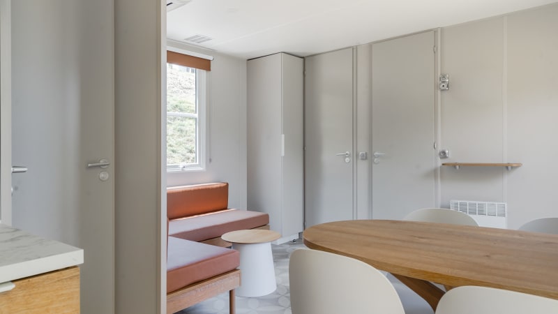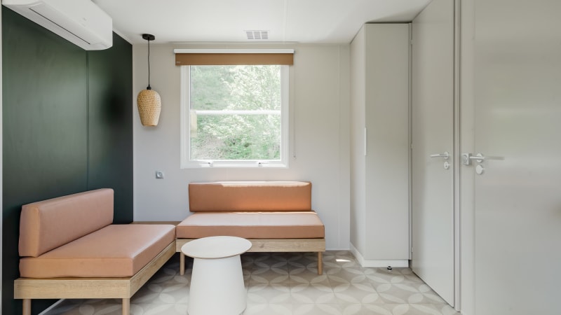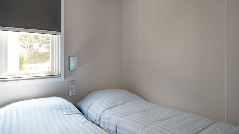 Ce mobil-home comprend deux chambres : une avec un lit double (160 x 200) et une avec deux lits simples (80 x 185). Tous les lits sont équipés de coussins et de couettes individuelles.