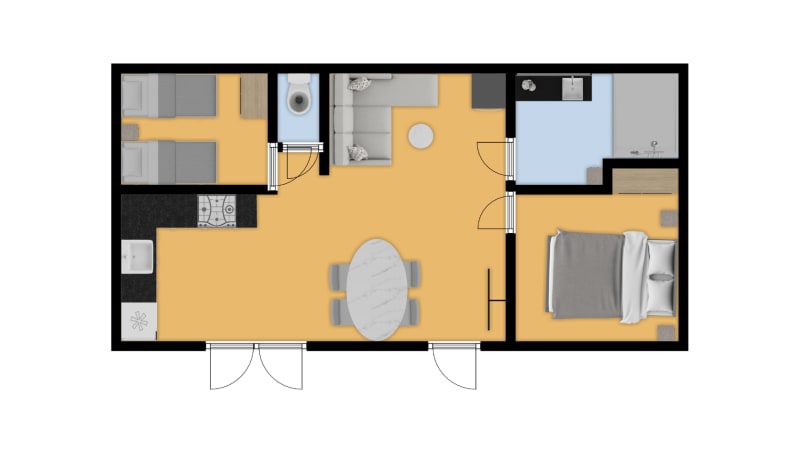 Le salon dispose d'un canapé et d'une table à manger conviviale avec quatre chaises. Les doubles portes vitrées vous donnent un accès direct à la terrasse.