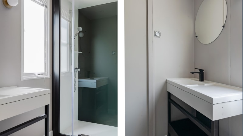 La salle de bains est équipée d'un lavabo, d'une cabine de douche avec douche italienne. De plus, il y a des toilettes séparées.