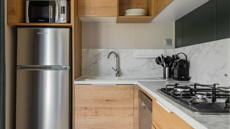 Ce mobil-home pour quatre personnes est situé sur un bel emplacement. L’endroit idéal pour passer de merveilleuses vacances au cœur de la nature en France. Cuisine