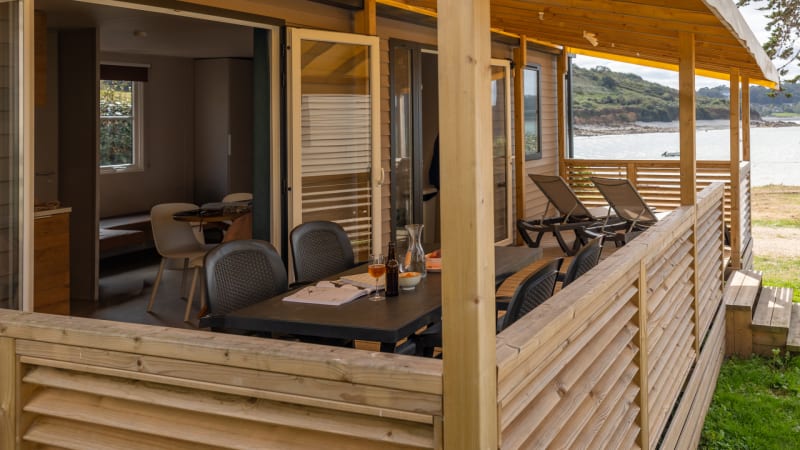Le mobil-home est doté de portes-fenêtres qui donnent un accés direct sur la terrasse semi-couverte. Celle-ci dispose d’un mobilier de jardin de deux transats confortables. Vous pouvez garer une voiture près du mobil-home.