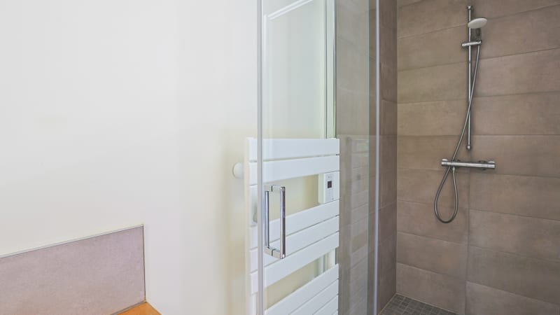 L'appartement dispose d'une cuisine spacieuse avec une plaque de cuisson en céramique à 3 feux, d'un réfrigérateur, d'un micro-ondes, d'une machine à café Nespresso, d'un lave-vaisselle et d'un évier avec mitigeur.