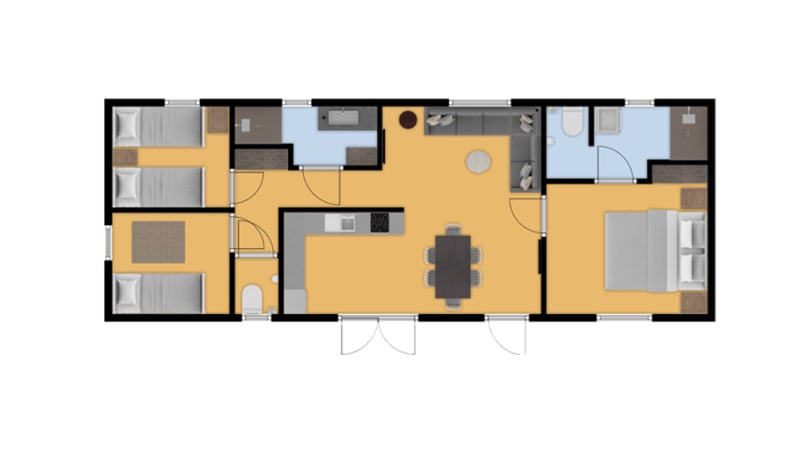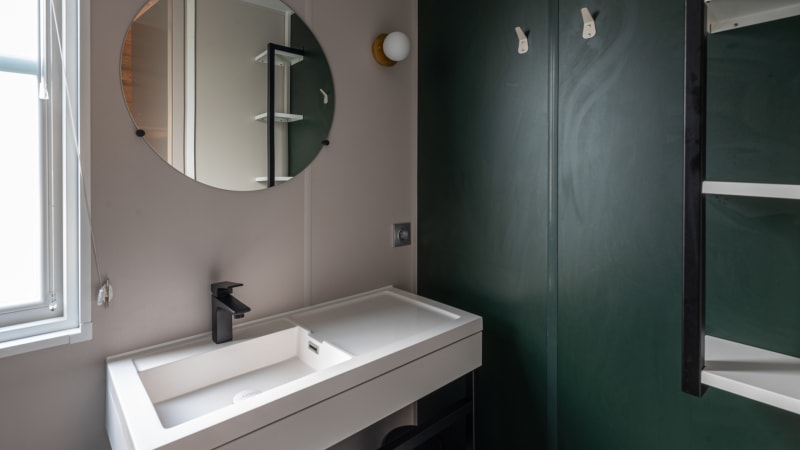 Le mobil-home comprend trois chambres dont une avec un lit deux personnes de 1,6 x 2 mètres et salle de bains privative. Les deux autres chambres disposent chacune de deux lits une personne de 0,8 x 1,9 mètres séparés. L’une des deux chambres a un lit mezzanine. Les chambres disposent d’oreillers et de couettes une personne. Il est possible d’y installer un lit bébé.