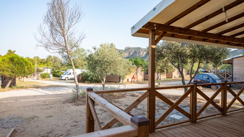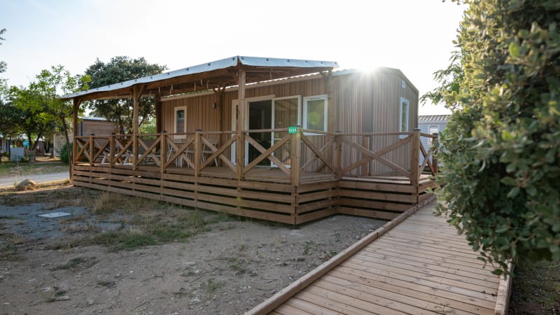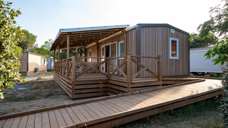 Le mobil-home dispose de portes-fenêtres très larges donnant sur la grande terrasse semi-couverte, aménagée d’un mobilier de jardin de luxe et de deux confortables transats. Vous pouvez garer votre voiture près du mobil-home. Le mobil-home et la terrasse sont accessibles par une rampe spéciale.